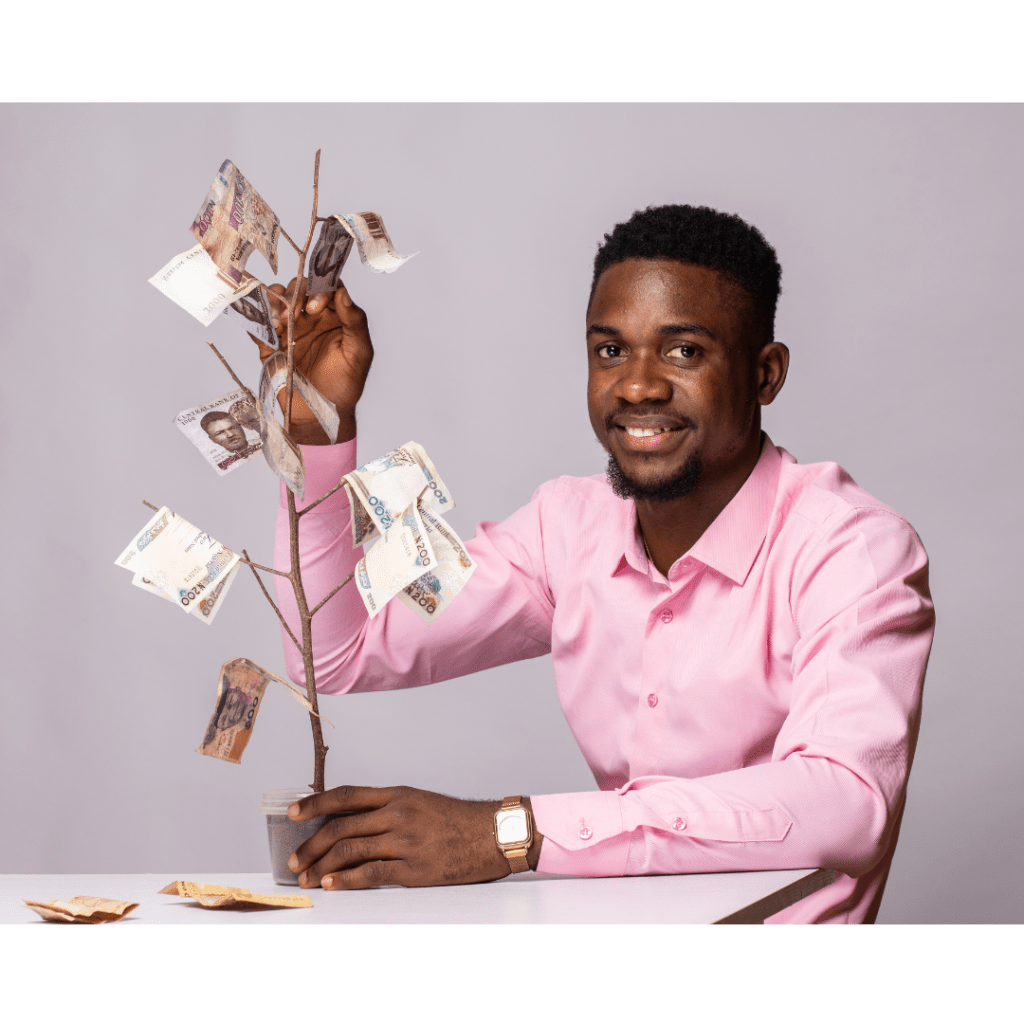 Person beside a DIY money tree.